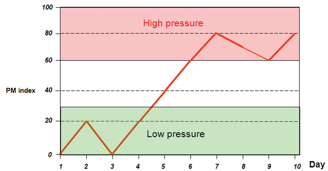 Dr. Gubler’s GPM model helps growers predict the onset of disease and sporulation by the pathogen so that growers can proactively treat for the disease without wasting resources. The model uses weather conditions to track the primary infection and lets growers know when to start treatment in the beginning of the season. In particular for tracking the secondary infection cycle, the model includes a powdery mildew index (PMI) that is an indicator of the growth conditions for the fungus. The PMI ranges from 0-100 and helps growers estimate the timing for their next fungicide application. (See figure at right)